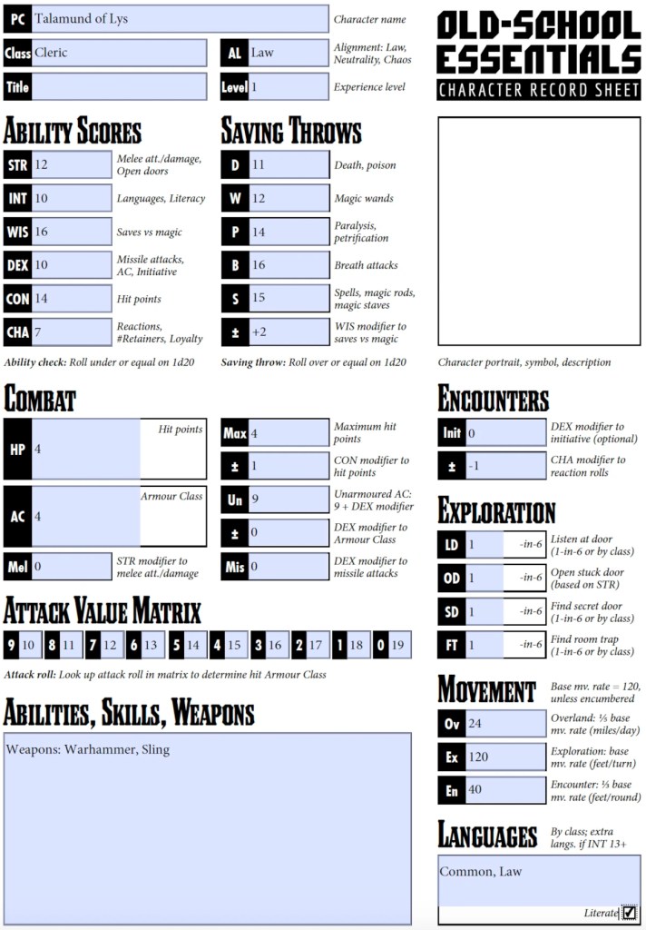 Day 4 of the #CharacterCreationChallenge has me going back to my roots with some Old School Essentials. Descending Armor Class and THAC0 FTW!