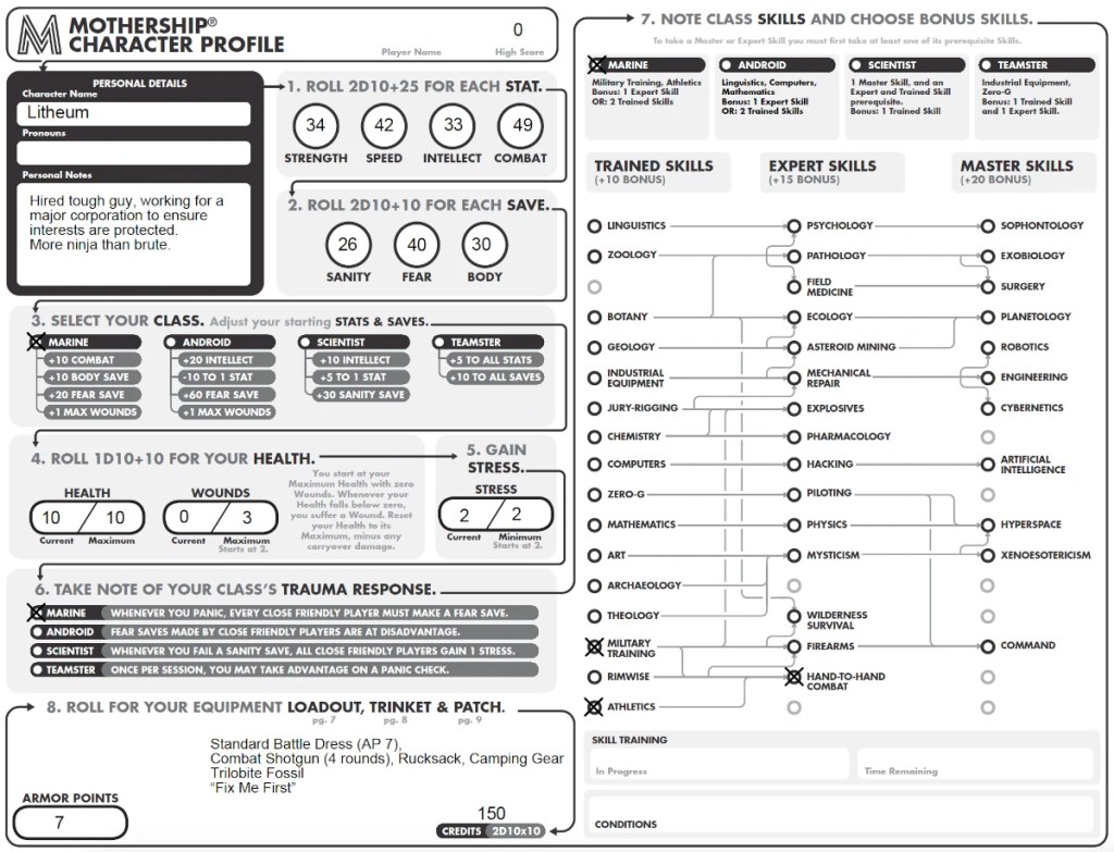 For Day 5 of the #CharacterCreationChallenge, we return to space with the game Mothership. Litheum is a marine who works for the Company and makes sure the Company’s interests are represented.