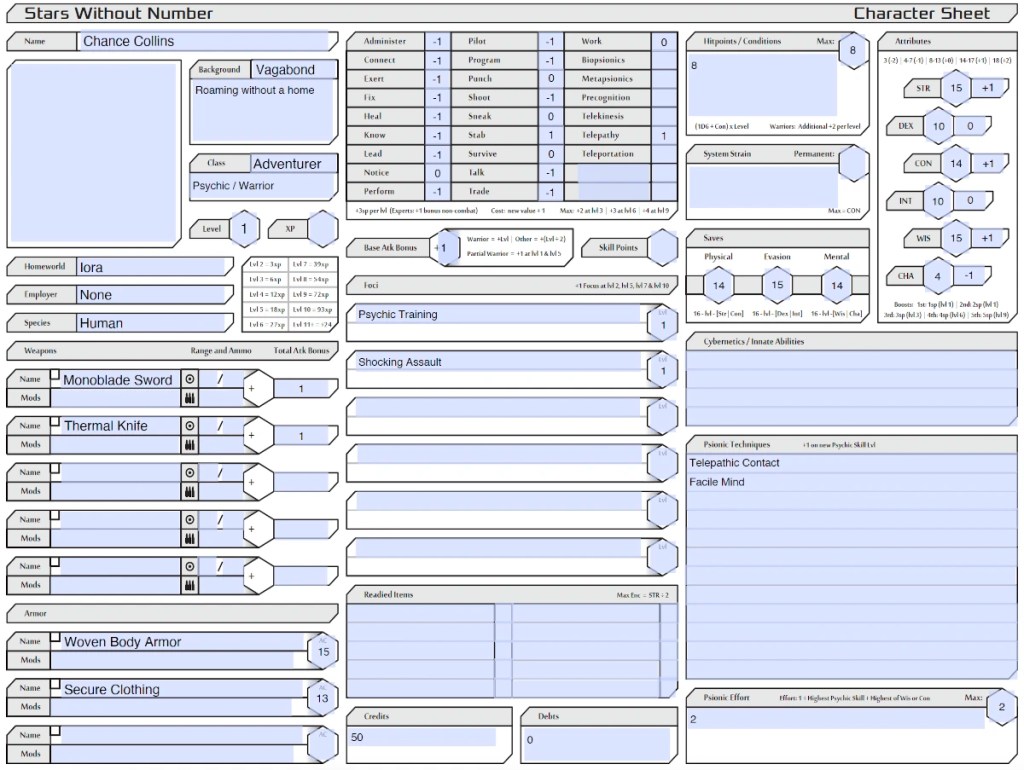 Looking at the stats, like my CWN character, this guy’s physically tough and pretty smart. I decided a restricted psychic/warrior Adventurer seemed to make sense and, with some worlds disfavoring psychics, adds to the reason why he has a bad way with people.