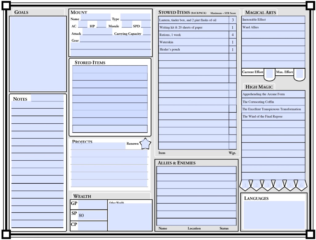 In this case, the random dice rolls allowed me to dabble in a more complex build, which is typically the case when magic becomes involved. The spells and arts are throwbacks to Jack Vance’s Dying Earth, with colorful names for traditional spell types. Without a campaign, though, it’s hard to judge how certain spells might get used and whether the choices made are going to keep my High Mage alive.