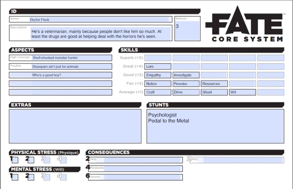 You also have to create aspects that describe your background in ways that can also be used in game to add both benefits and complications. This requires working with the other players and, for this character creation exercise, there are no other players. Therefore I only created one for Dr Fleck’s own history and left the other two to be developed if he ever gets played.