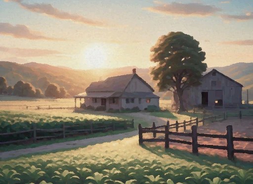 The entire scene is very quiet. No movement in the fields, no sounds from the house or barn. The corral is empty and the gate left open.