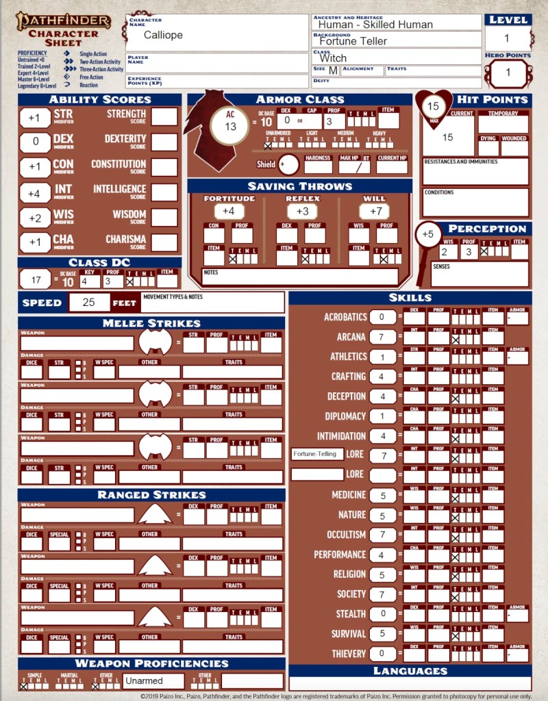 For this challenge, I did want to challenge myself, and so I chose the Witch. I also decided to use the official Pathfinder character sheet. I’m pretty sure it’s pre-Remaster, while I invested in the Remaster books, having come to Pathfinder late.