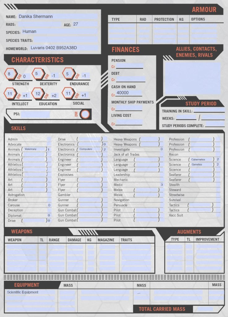 Hoo boy! Day 27 of the #CharacterCreationChallenge and I waded into the deep end with a character for Traveller: Danika Shermann.