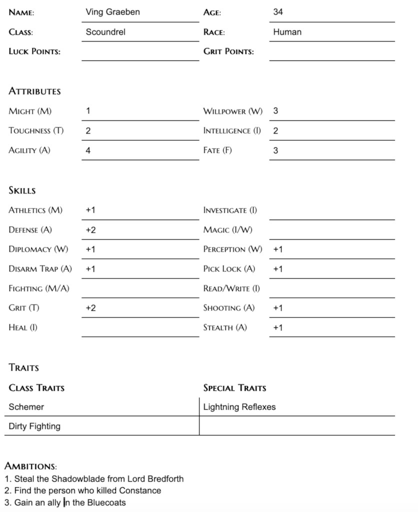 The build was easy – six attributes and a standard array of dice: 4, 3, 3, 2, 2, 1 that you assign to your attributes. Your class determines your skills and you Class Traits and you then get to select one Special Trait.