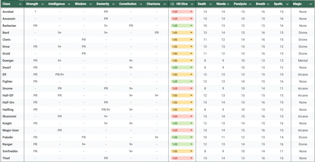 Once you have your attributes generated, you want to choose your class. A few classes have one or more minimum stat requirements. All stats embrace a concept of Prime Requisites, though those only contribute as an Experience Point (XP) modifier, which I’ll discuss further. All this to say that, given a particular set of rolled attributes, your choice of class may be limited. The book does not summarize those, forcing you to look at each class of interest to see if you can take it. I made myself a matrix to more easily review them. You’re welcome to view and copy the Google Sheet if you find it helpful.
